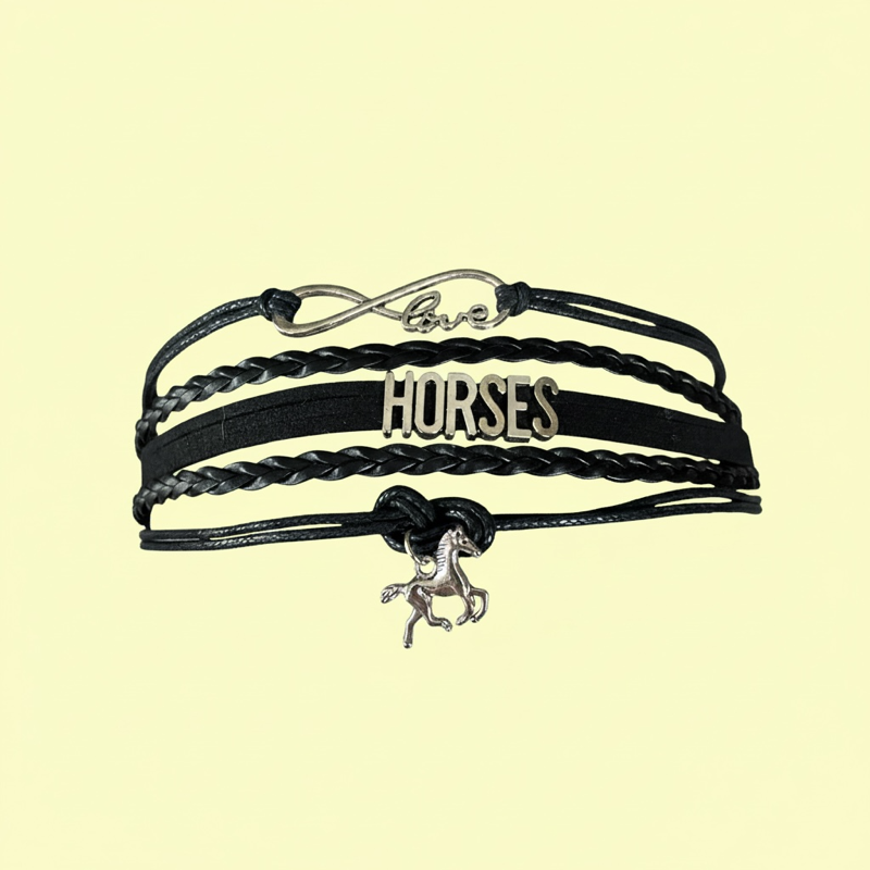 Home > Polyurethane Braided Snap Bracelet Accented with Silver Plated “Horses & Love”.